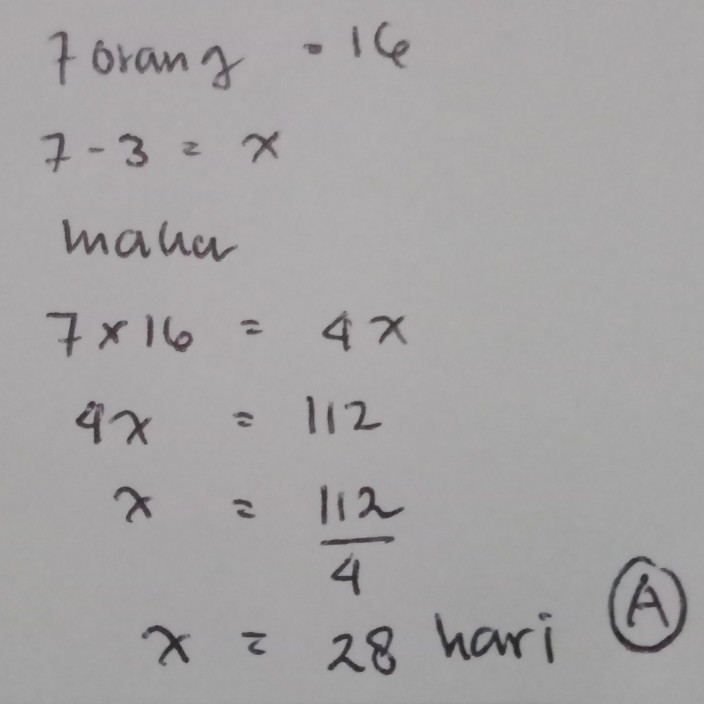Apabila pekerja ditambah 3 orang, maka pekerjaan tersebut dapat selesai dalam waktu. Jika 3 pekerja ditugaskan ke pekerjaan lain, lama waktu yang bisa diselesaikan oleh pekerja yang tersisa adalah. Terjawab • terverifikasi oleh ahli. Suatu pekerjaan dapat diselesaikan selama 16 hari oleh 7 orang. Dan tidak kulihat hari yang lebih buruk dan muram selain ketika rasulullah shallallahu 'alaihi wa sallam meninggalkan dunia. hampir akal dan hati mereka tidak sanggup menanggung beban musibah tersebut.